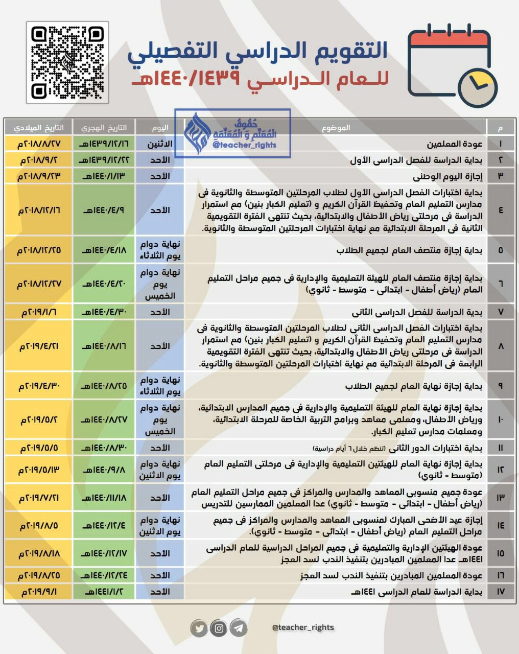 حدد التقويم الدراسي التفصيلي للعام الدراسي 1438 / 1439 بحسب تغريدة حساب المعلمين بتويتر، عودة الكادر الإداري التعليمي في المدارس لتكون خلال الفترة الصيفية بتاريخ الأحد 16 ذي القعدة 1439 إلى نهاية 4 ذي الحجة 1439هـ، وذلك فيما المعلمون الممارسون للتدريس وهم. التقويم الدراسي للعام الدراسي 1442. التقويم الدراسي 1443 عودة المعلمين. #التقويم_الدراسي_الجديد 1443هـ؛ المتضمن الفصول الدراسية الثلاثة. نشرت وزارة التعليم تفاصيل التقويم الدراسي وأهم ملامحه اعتبارًا من العام الدراسي القادم وحتى عام ١٤٤٣.